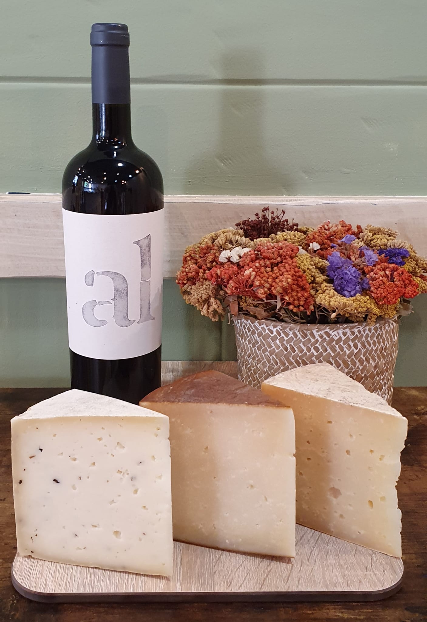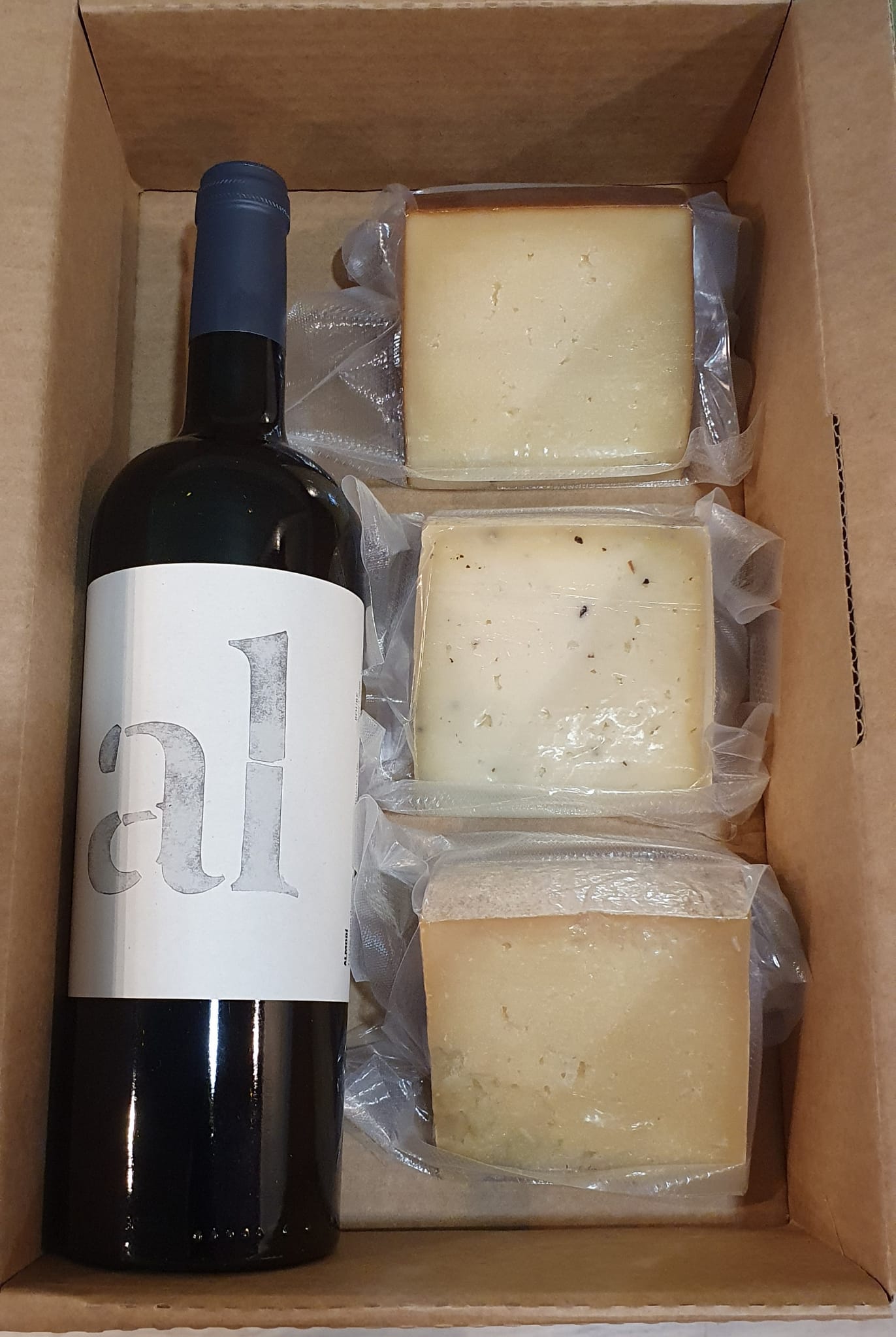 En este lote encontraréis un vino tinto con denominación de origen Terra Alta, el Almodí Roure elaborado por la bodega Altavins. Este vino es 100% garnatxa borruda y con una maduración de cuatro meses en barrica de roble francés. También encontraréis tres quesos de leche cruda de oveja elaborados por la Queseria Mercado del Val. El primero es lo Campoveja Semicurado de Trufa, es un queso con tres meses de maduración y trufa natural. A continuación tenemos un Campoveja Ahumado, este queso tiene una maduración de ocho meses y está ahumado con maderas nobles. Y para acabar tenemos el Campoveja Añejo, con una maduración en cueva de dieciséis meses y sobre tabla de madera como se hacía antiguamente.